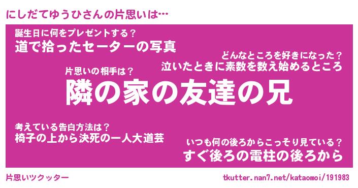 | 胡散臭い通販商品みたいなあだ名 | 『必ず成功する霊験あらたかなお札…その名も「にしだてゆうひ」』 |