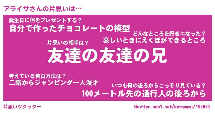 | 意味不明あだ名 | 『ペロリンアライサ』『永久保存アライサ』 |
