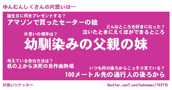 | 男性向けラノベタイトル風あだ名 | 『ゆんむんしくの憂鬱』 |