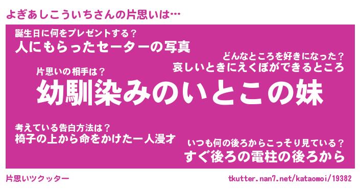 | 男性向けラノベタイトル風あだ名 | 『よぎあしこういちの憂鬱』 |