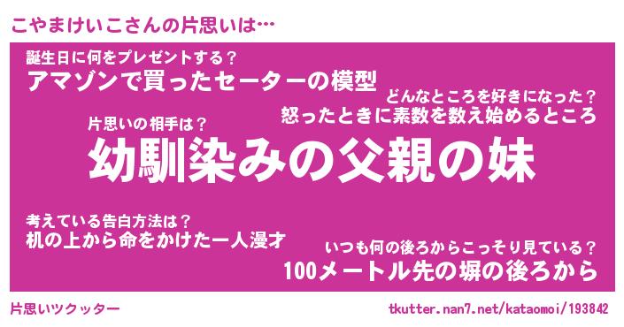| 男性向けラノベタイトル風あだ名 | 『こやまけいこの憂鬱』 |