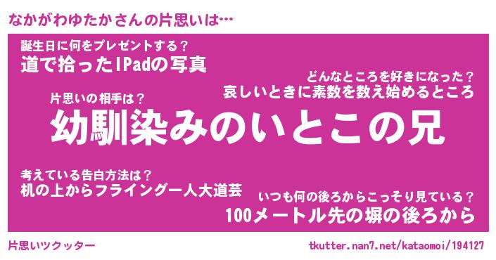| 男性向けラノベタイトル風あだ名 | 『なかがわゆたかの憂鬱』 |