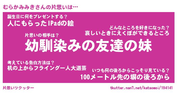 | 男性向けラノベタイトル風あだ名 | 『むらかみみきの憂鬱』 |