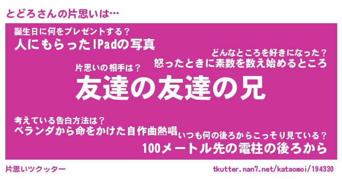 | ヘコむあだ名 | 『とどっふぃ~』『つくし』『とどお』 |