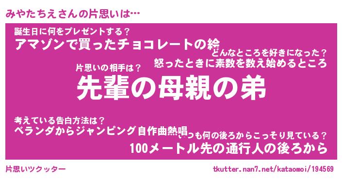 | ヒーロー風カッコイイあだ名 | 『スーパーミヤタチエ』『天弓騎士ミヤ』 |