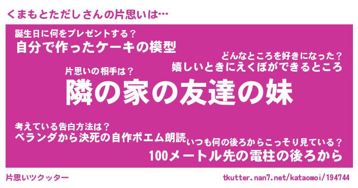 | ヘコむあだ名 | 『くまっふぃ~』『つくし』『くまお』 |