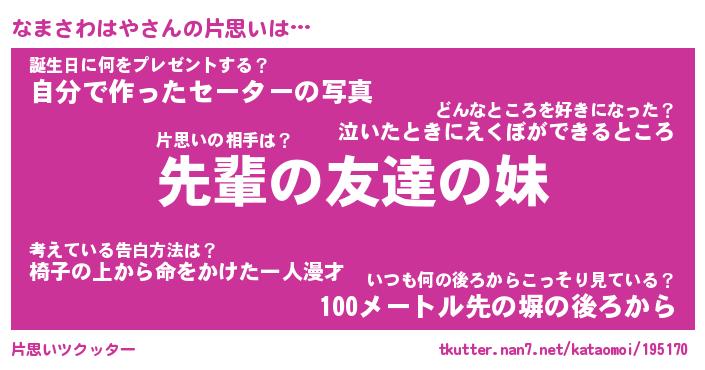 | ヒーロー風カッコイイあだ名 | 『スーパーナマサワハヤ』『幻影騎士ナマ』 |