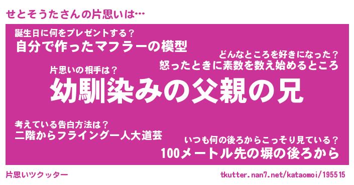 | ヘコむあだ名 | 『せとにゅー』『つくし』『せと太郎』 |