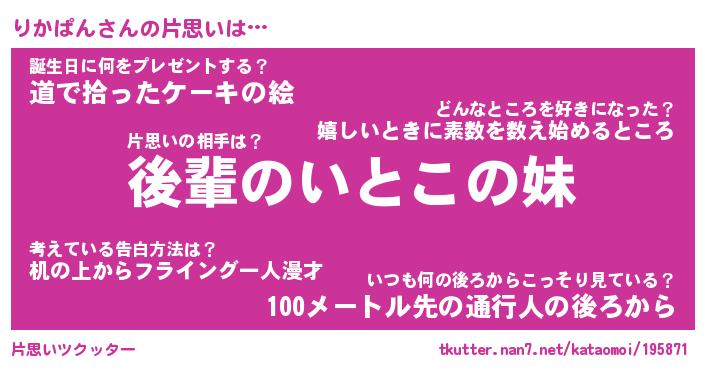 | 意味不明あだ名 | 『ペロリンりかぱん』『永久保存りかぱん』 |