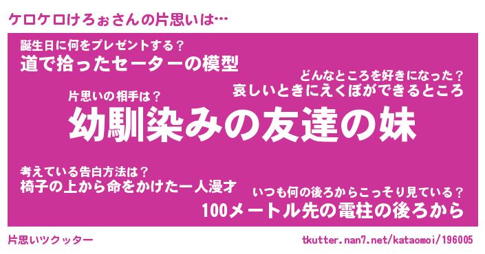 | ヘコむあだ名 | 『ケロっふぃ~』『豆乳』『ケロお』 |