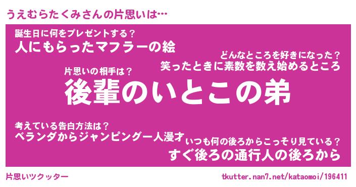 | ツイッター | うえむらたくみさんのツイッターID『dendenmushi_idle』 |