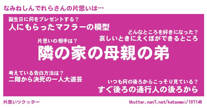 | 男性向けラノベタイトル風あだ名 | 『なみねしんでれらの憂鬱』 |