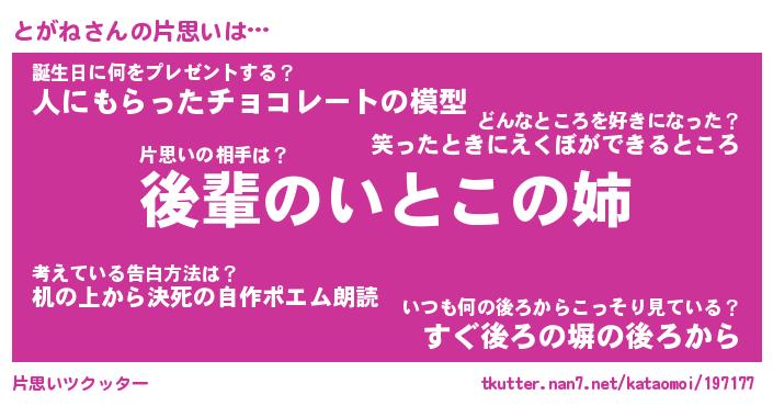 | ヘコむあだ名 | 『とがにゅー』『牛乳』『とがっ子』 |