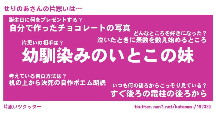 | ヘコむあだ名 | 『せりもー』『つくし』『せりっぺ』 |