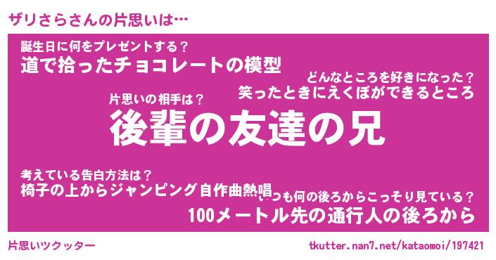 | 意味不明あだ名 | 『ペロリンザリさら』『永久保存ザリさら』 |