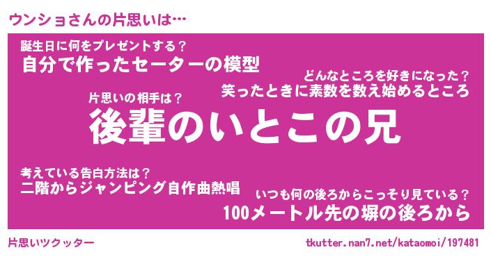 | ツイッター | ウンショさんのツイッターID『dendenmushi_idle』 |
