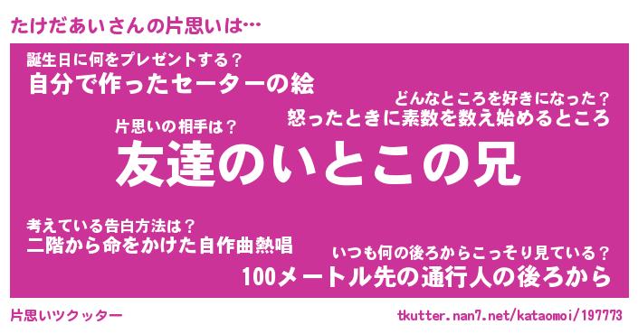 | ヘコむあだ名 | 『たけもー』『牛乳』『たけっちょ』 |