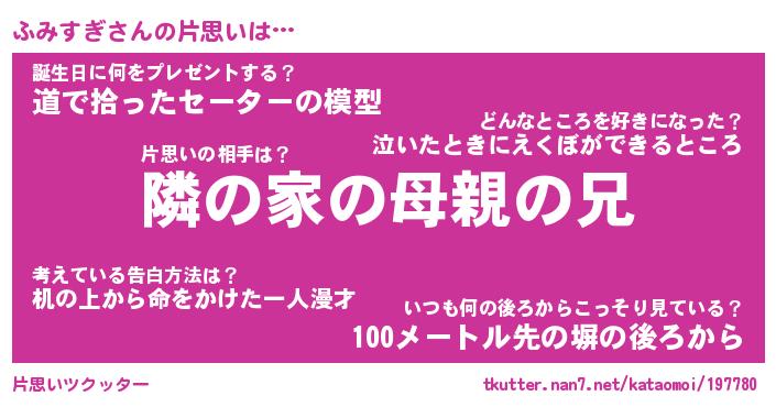 | 胡散臭い通販商品みたいなあだ名 | 『必ず成功するブレスレット…その名も「ふみすぎ」』 |