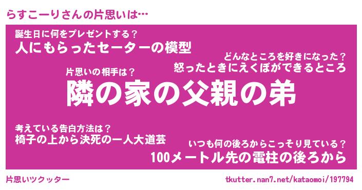 | ヘコむあだ名 | 『らすふぇ~』『酢こんぶ』『らすを』 |