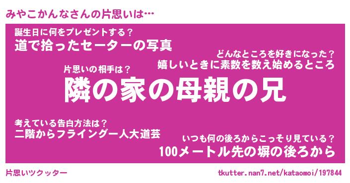 | ヘコむあだ名 | 『みやにー』『豆乳』『みやっ子』 |