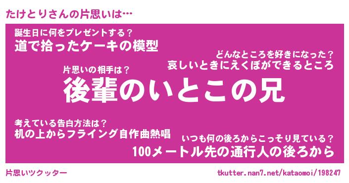 | 意味不明あだ名 | 『ペロリンたけとり』『永久保存たけとり』 |