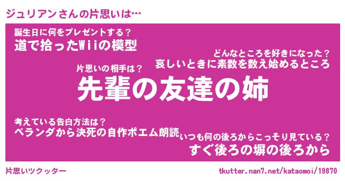 | 胡散臭い通販商品みたいなあだ名 | 『モテモテ間違いなし霊験あらたかなお札…その名も「ジュリアン」』 |