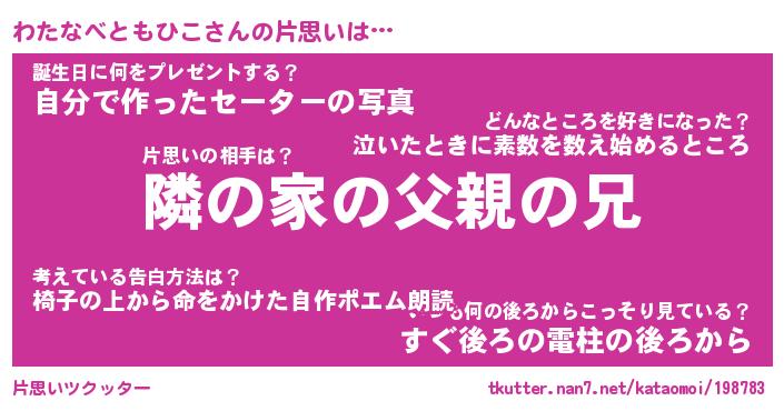 | 男性向けラノベタイトル風あだ名 | 『わたなべともひこの憂鬱』 |