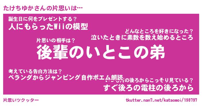 | ヘコむあだ名 | 『たけもー』『酢こんぶ』『たけっぺ』 |