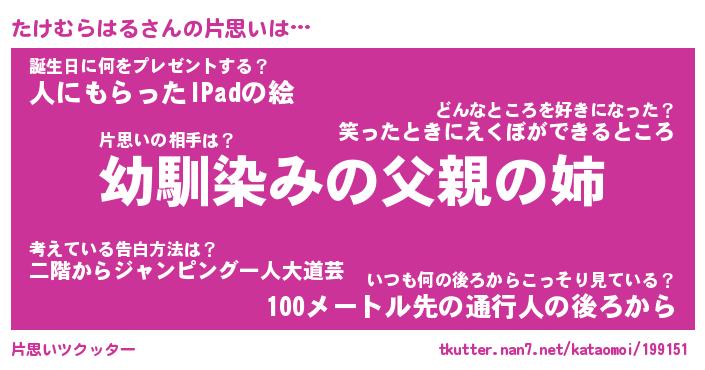 | 男性向けラノベタイトル風あだ名 | 『たけむらはるの憂鬱』 |