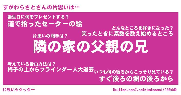 | 胡散臭い通販商品みたいなあだ名 | 『必ず成功するブレスレット…その名も「すがわらさと」』 |