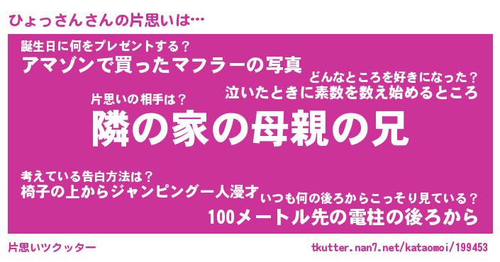 | 男性向けラノベタイトル風あだ名 | 『ひょっさんの憂鬱』 |