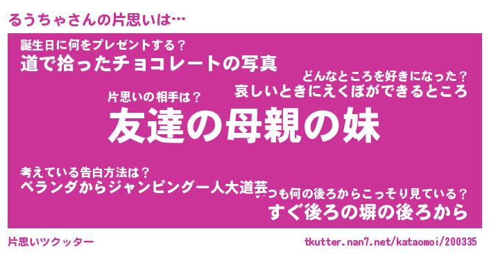 | 胡散臭い通販商品みたいなあだ名 | 『億万長者になれるブレスレット…その名も「るうちゃ」』 |