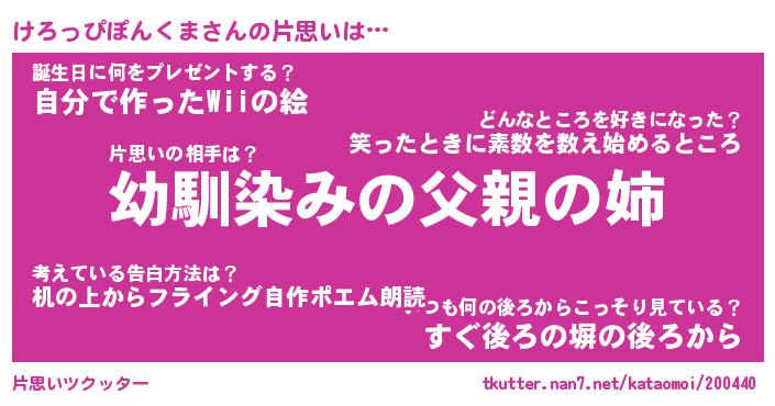 | ヘコむあだ名 | 『けろふぇ~』『つくし』 |