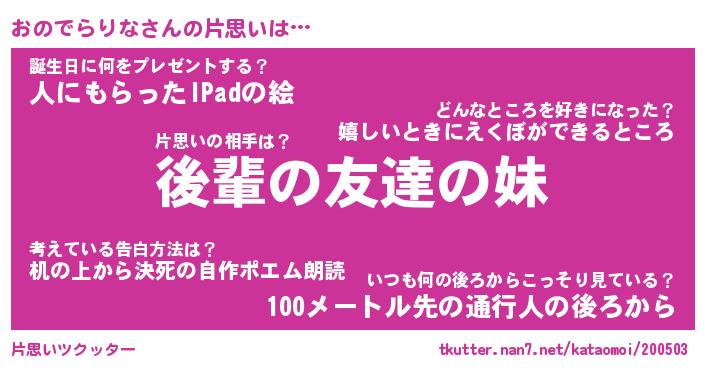 | 恥ずかしいあだ名 | 『プリティーおのでらりな』『おのっちょ』 |