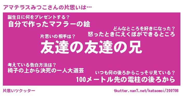 | 男性向けラノベタイトル風あだ名 | 『アマテラスミツコアートオンライン』 |