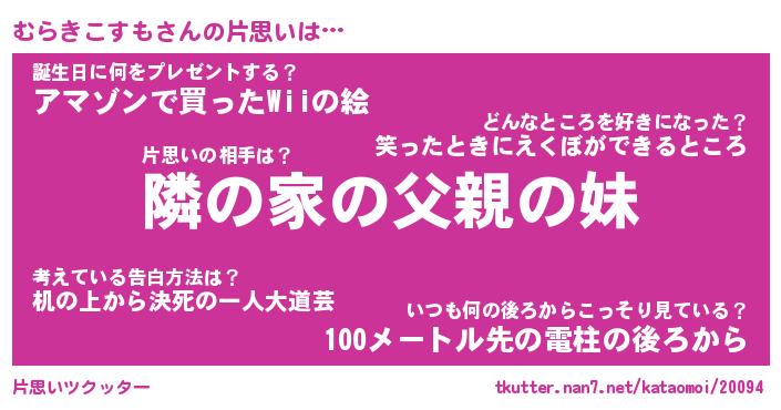 | 男性向けラノベタイトル風あだ名 | 『むらきこすもの憂鬱』 |