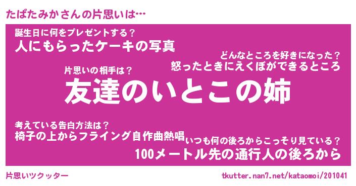 | ファンタジー風あだ名 | 『タバフェル』『エターナルタバタミカー』 |