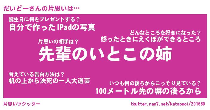 | 胡散臭い通販商品みたいなあだ名 | 『モテモテ間違いなし水晶球…その名も「だいどー」』 |