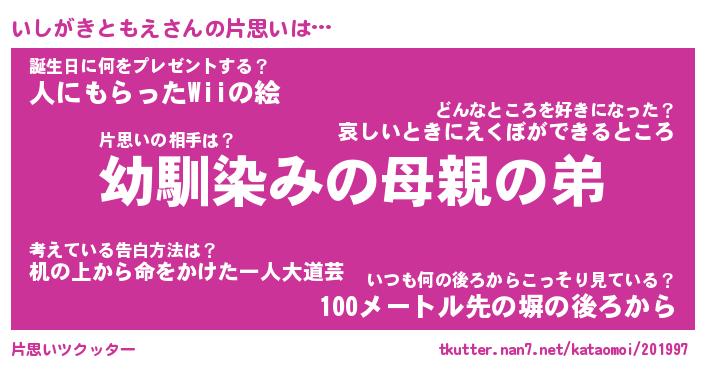 | ヘコむあだ名 | 『いしにー』『酢こんぶ』『いしっ子』 |