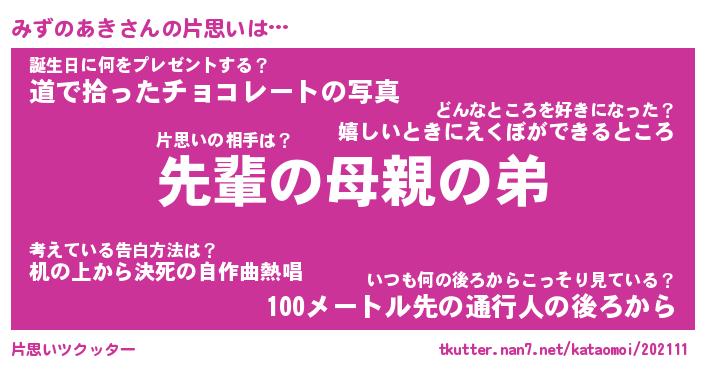 | ヘコむあだ名 | 『みずにー』『牛乳』『みず太郎』 |