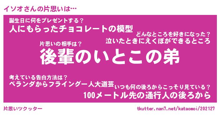 | 意味不明あだ名 | 『ペロリンイソオ』『イソオフォーエバー』 |
