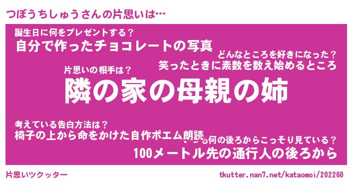 | 男性向けラノベタイトル風あだ名 | 『つぼうちしゅうの憂鬱』 |