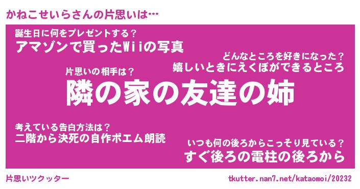 | 伝説のあだ名 | 『伝説のスナイパーかねこせいら』 |