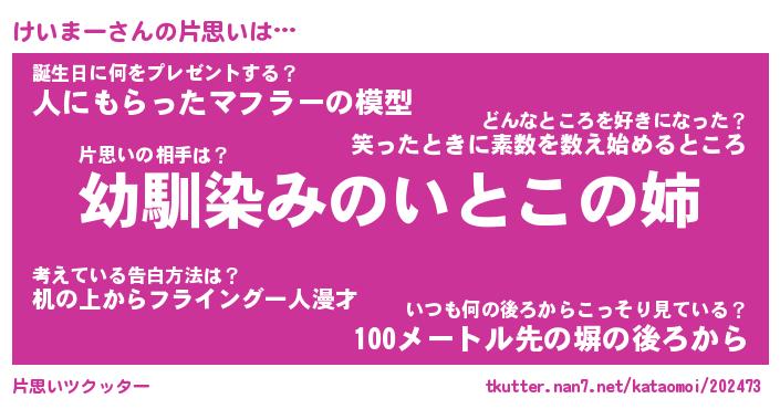 | 男性向けラノベタイトル風あだ名 | 『けいまーの憂鬱』 |