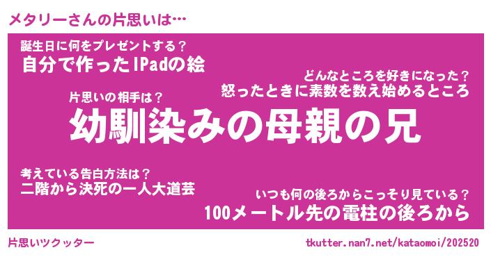| 意味不明あだ名 | 『ペロリンメタリー』『永久保存メタリー』 |