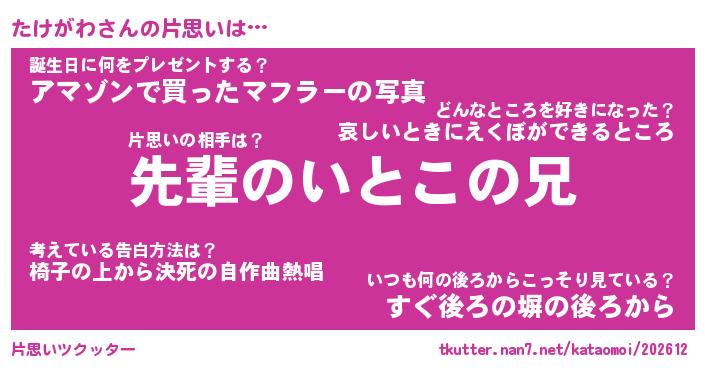 | 意味不明あだ名 | 『ペロリンたけがわ』『永久保存たけがわ』 |