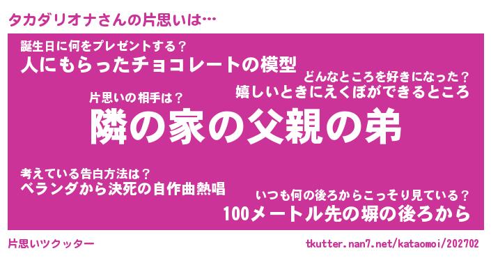 | 男性向けラノベタイトル風あだ名 | 『タカダリオナの憂鬱』 |