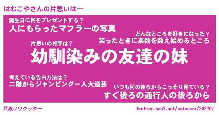 | 男性向けラノベタイトル風あだ名 | 『はむこやの憂鬱』 |