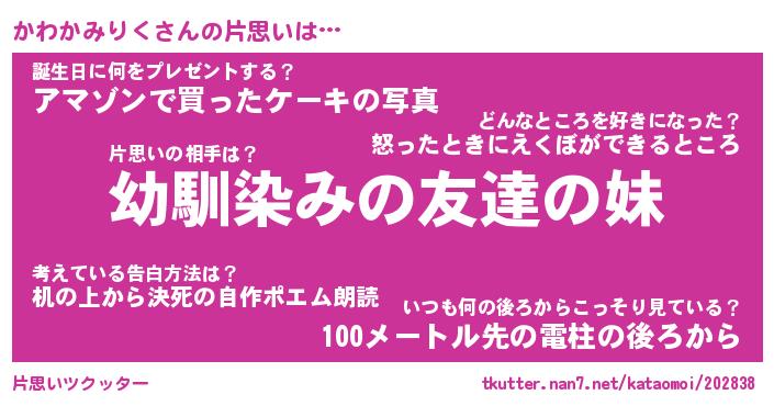 | 男性向けラノベタイトル風あだ名 | 『かわかみりくの憂鬱』 |
