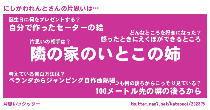 | 胡散臭い通販商品みたいなあだ名 | 『必ず成功する霊験あらたかなお札…その名も「にしかわれんと」』 |
